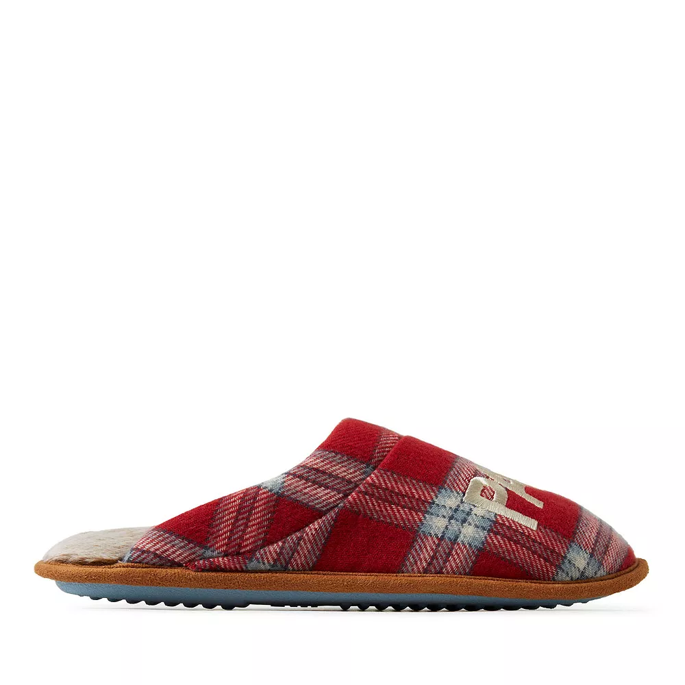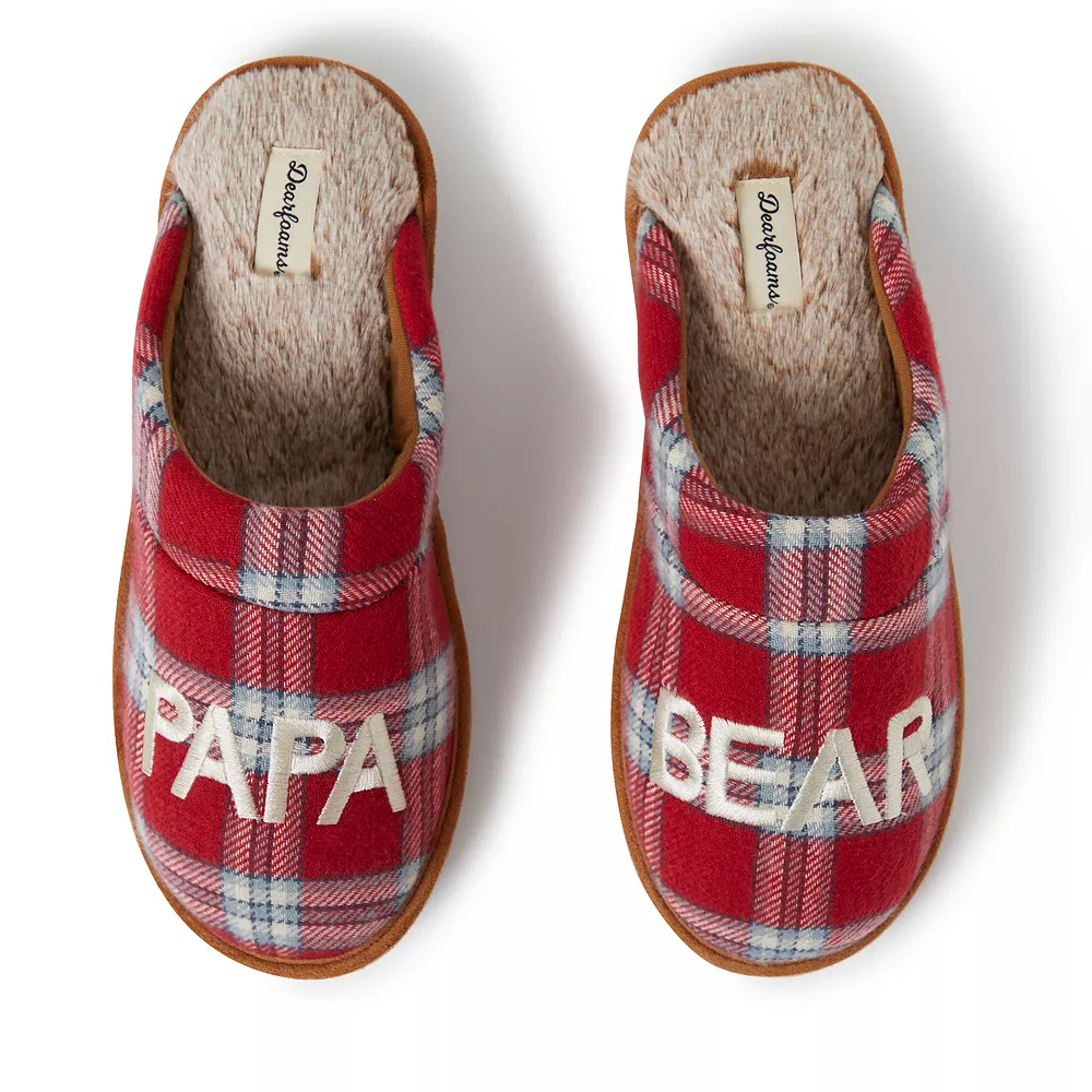 These Men’s Dearfoams Papa Bear Red Plaid Scuff Slippers are a great choice for daily relaxation this holiday.